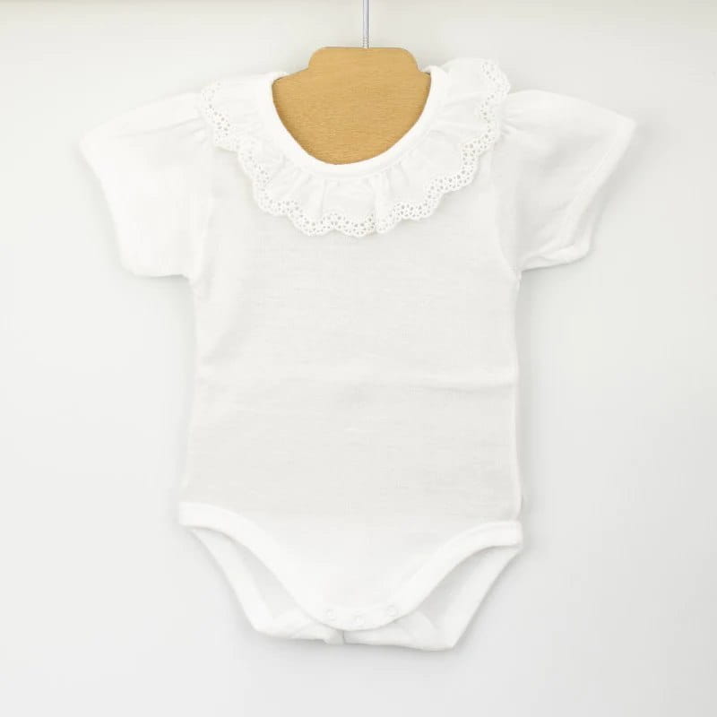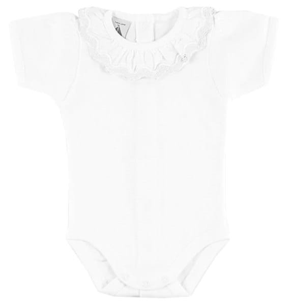 Body w kolorze białym z koronką na kołnierzyku, krótki rękaw.
