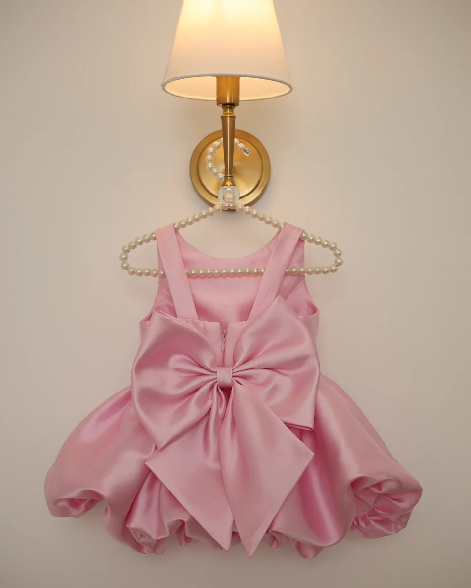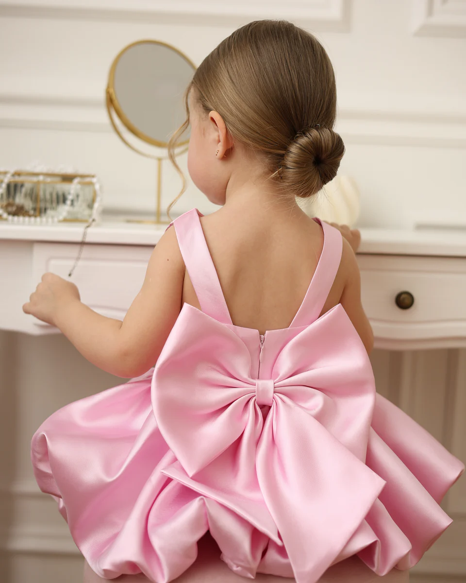 Urocza, elegancka sukienka dla dziewczynki. Model zachwyca minimalistycznym krojem z efektowną, dużą kokardą z tyłu, która nadaje stylizacji wyjątkowego charakteru. Delikatnie rozkloszowany dół pięknie układa się w ruchu, tworząc subtelny efekt „balonowej” spódnicy.