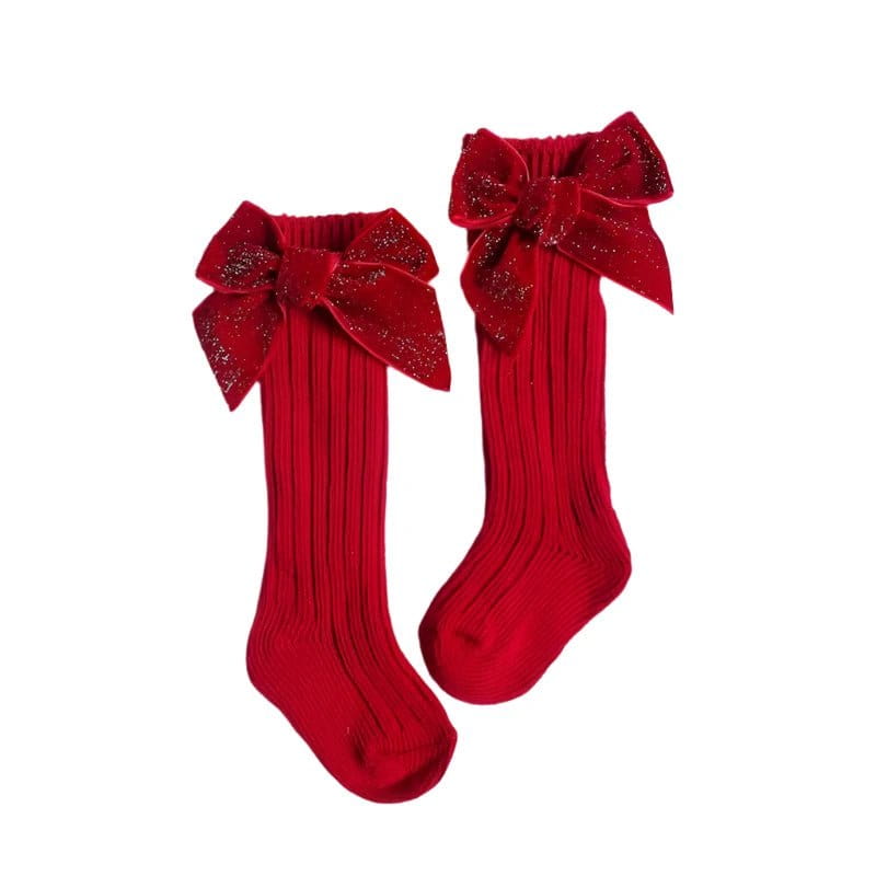 Podkolanówki prążkowane czerwone z błyszczącą kokardą. Idealne do świątecznych stylizacji.