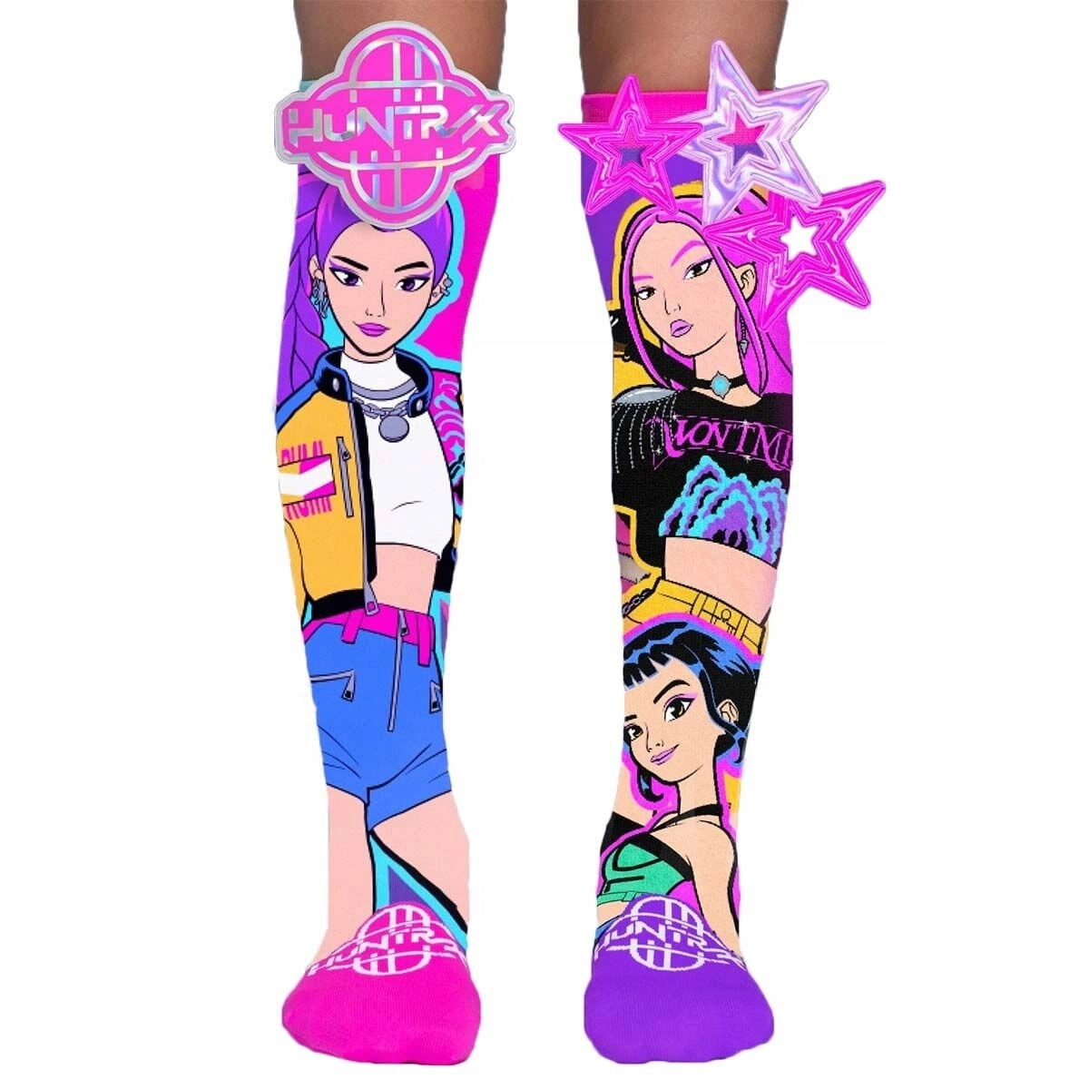 Poczuj się cool z tymi elektryzującymi skarpetkami Huntrix, ozdobionymi holograficznym emblematem „Huntrix” oraz srebrno-różowymi gwiazdkami, które mienią się przy każdym ruchu.