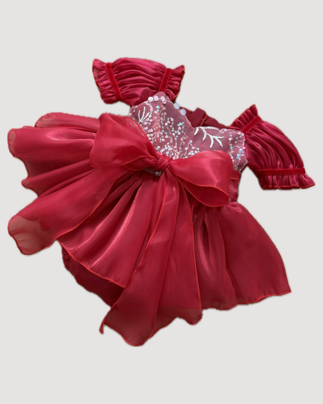 Ten wyjątkowy rampers to prawdziwa perełka wśród kreacji dla dziewczynek. Intensywny czerwony kolor w połączeniu z połyskującą, zdobioną cekinami górą przyciąga wzrok i nadaje całości niezwykle eleganckiego charakteru. Przód rampersa mieni się delikatnie dzięki aplikacjom, które pięknie odbijają światło, tworząc efekt subtelnego blasku.