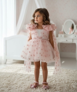 Szukasz kreacji, która sprawi, że Twoja córka poczuje się jak w bajce? Ta wyjątkowa sukienka z motywem serduszek to połączenie subtelności, elegancji i dziecięcej radości. Wykonana z lekkiego, wielowarstwowego tiulu, zachwyca objętością i finezyjnymi detalami.