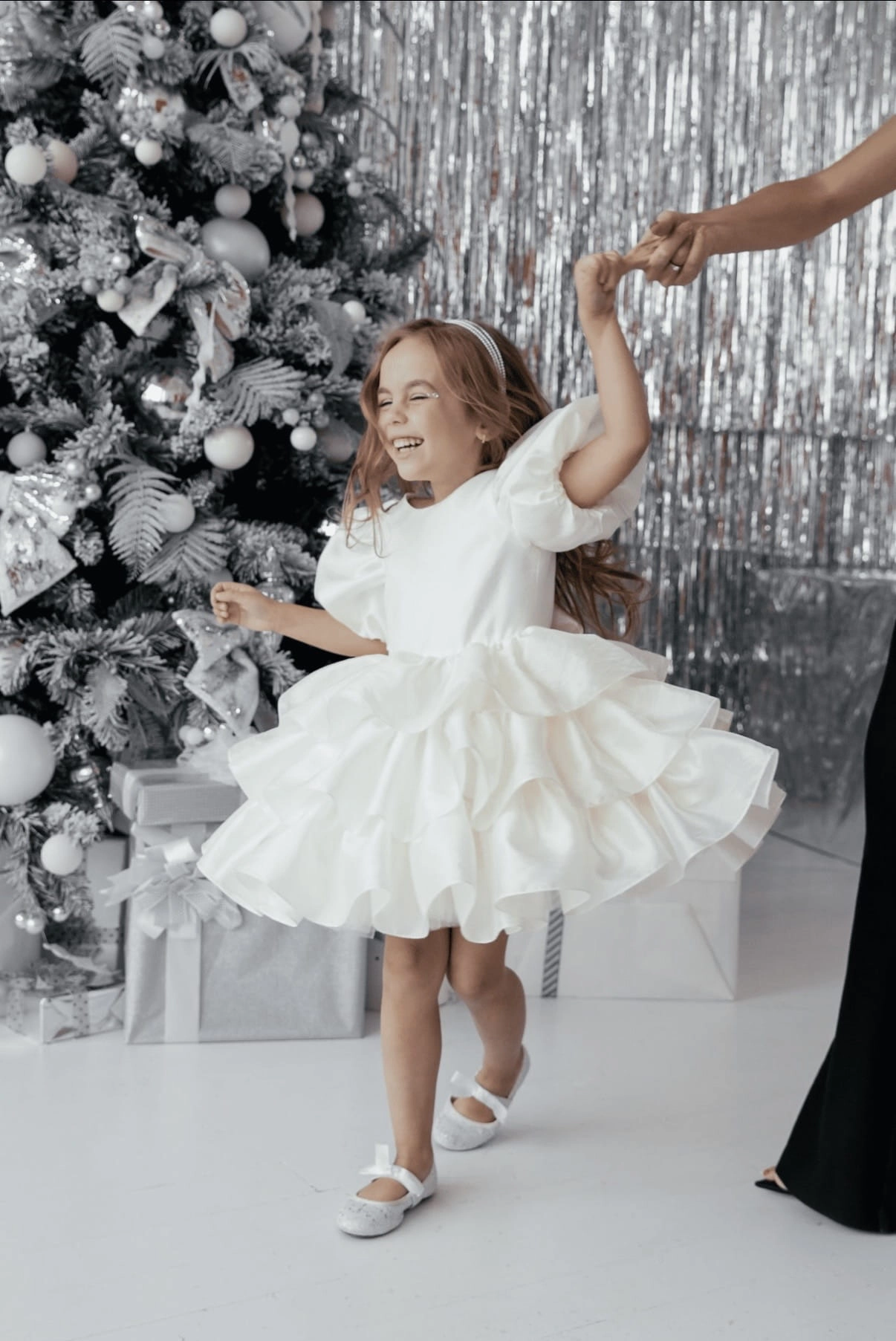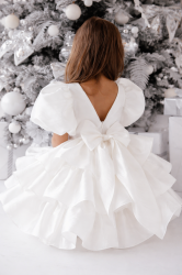 Elegancka, dziewczęca sukienka w kolorze bieli, stworzona z myślą o wyjątkowych okazjach. Model zachwyca efektowną, rozkloszowaną formą z wielowarstwowymi falbanami, które nadają kreacji lekkości i bajkowego charakteru. Bufiaste rękawy dodają objętości i podkreślają uroczysty styl, a głębokie wycięcie na plecach zakończone dużą, dekoracyjną kokardą przyciąga spojrzenia i stanowi wyjątkowy detal.