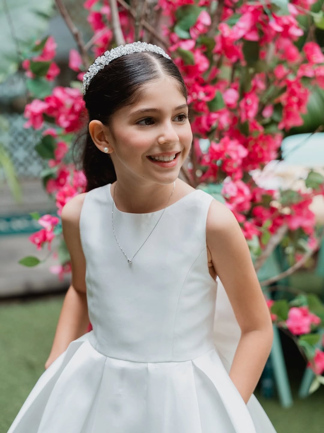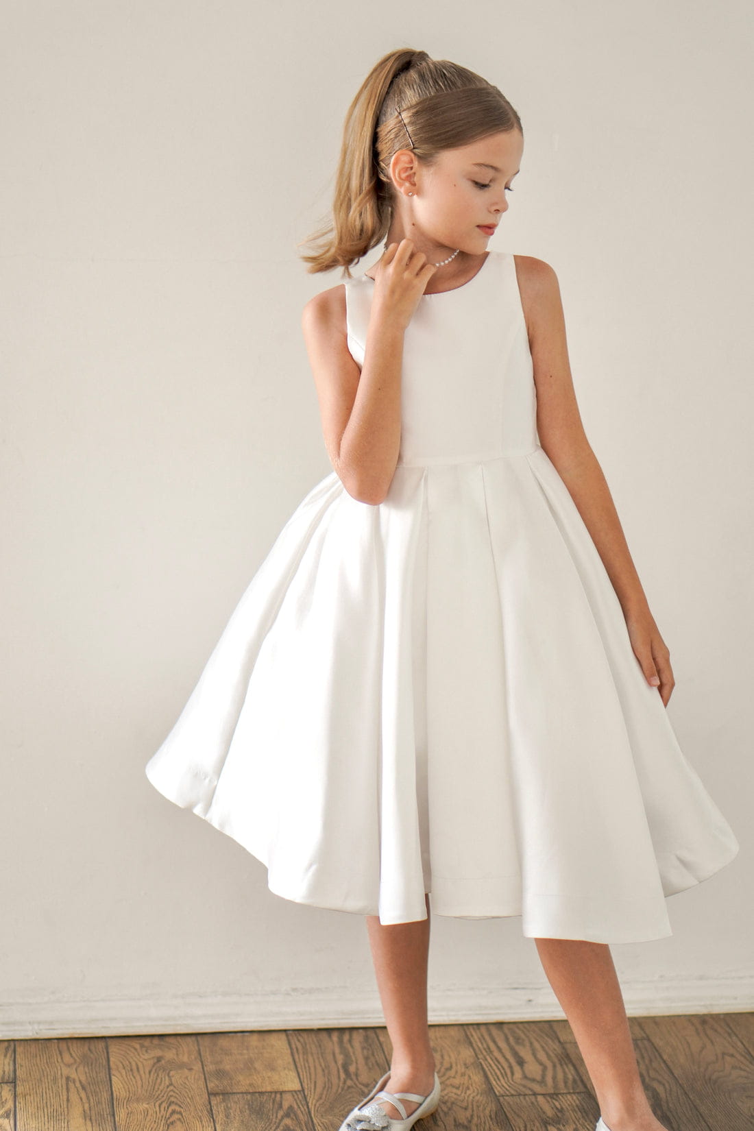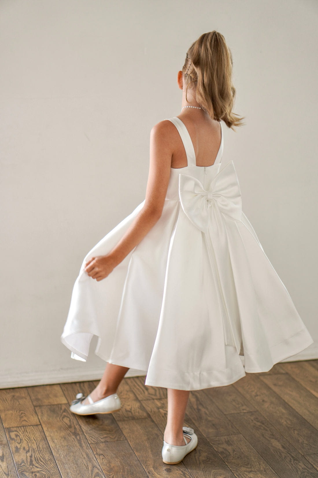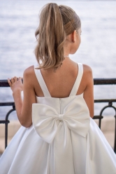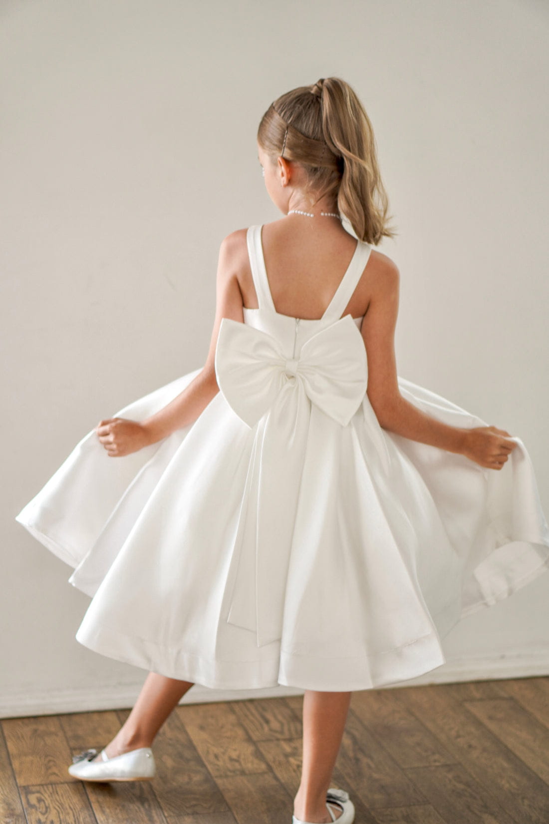 Zjawiskowa, klasyczna sukienka dla dziewczynki, która zachwyca swoją ponadczasową elegancją i subtelnym urokiem. Model wykonany z tkaniny Mikado z rozkloszowanym dołem oraz spektakularną, dużą kokardą z tyłu, tworzy prawdziwie bajkowy efekt.