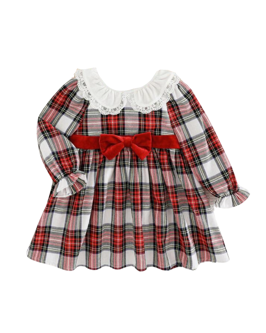 Świąteczna sukienka dla dziewczynki w kratę z czerwoną kokardą.