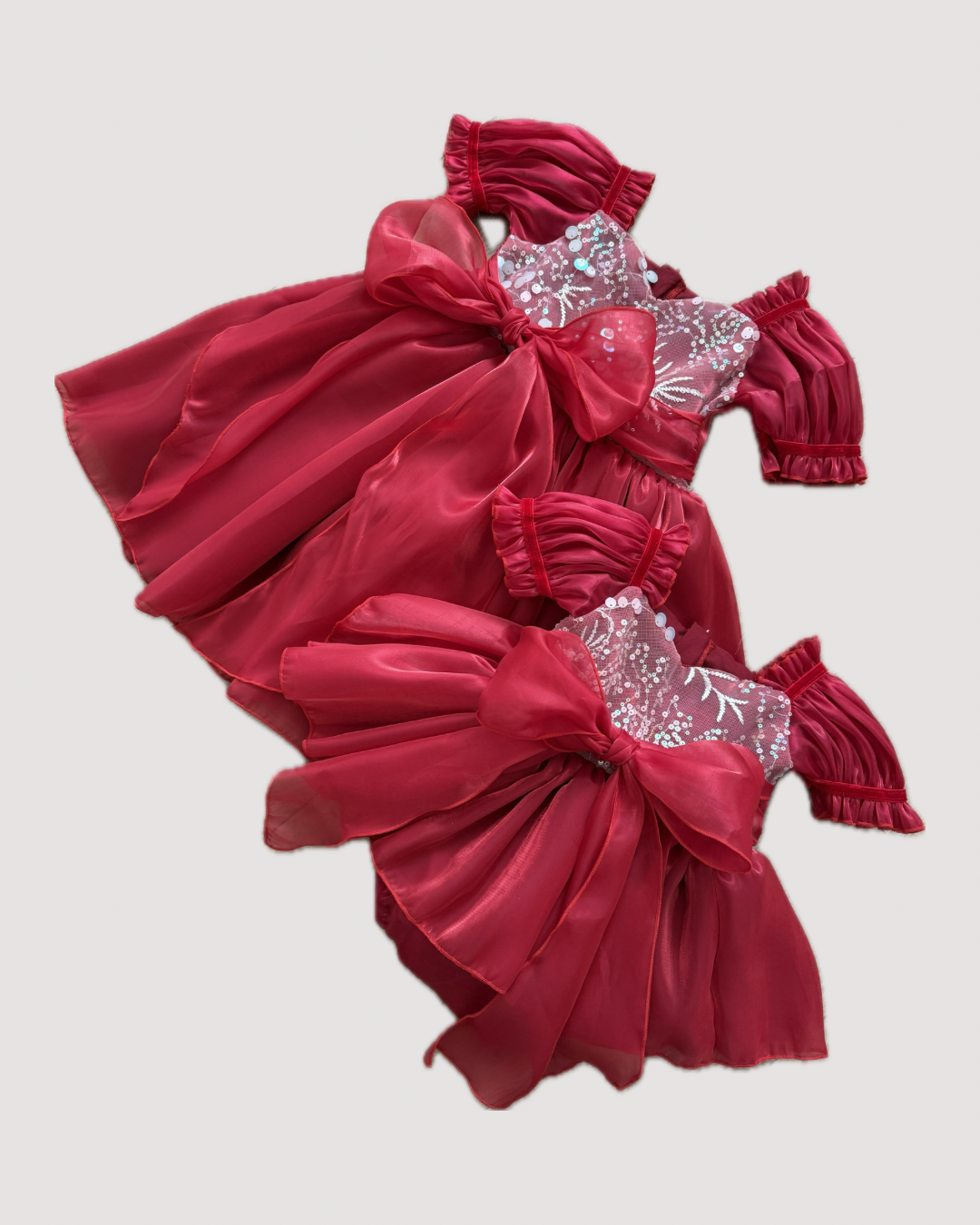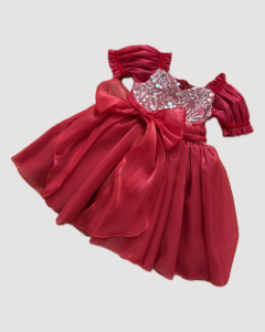 Ta wyjątkowa sukienka to prawdziwa perełka wśród kreacji dla dziewczynek. Intensywny czerwony kolor w połączeniu z połyskującą, zdobioną cekinami górą przyciąga wzrok i nadaje całości niezwykle eleganckiego charakteru. Przód sukienki mieni się delikatnie dzięki aplikacjom, które pięknie odbijają światło, tworząc efekt subtelnego blasku.