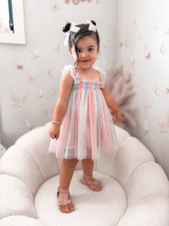 Tęczowa sukienka dla dziewczynki na ramiączkach ozdobiona złotymi gwiazdkami i księżycami.