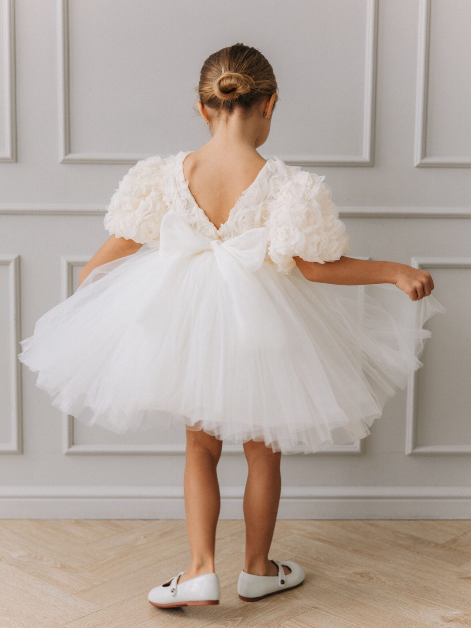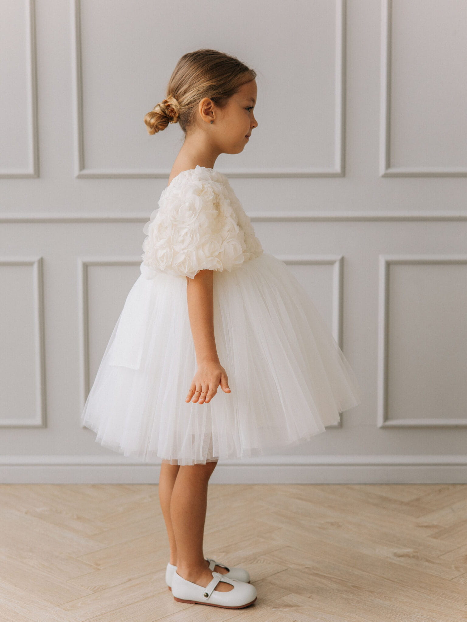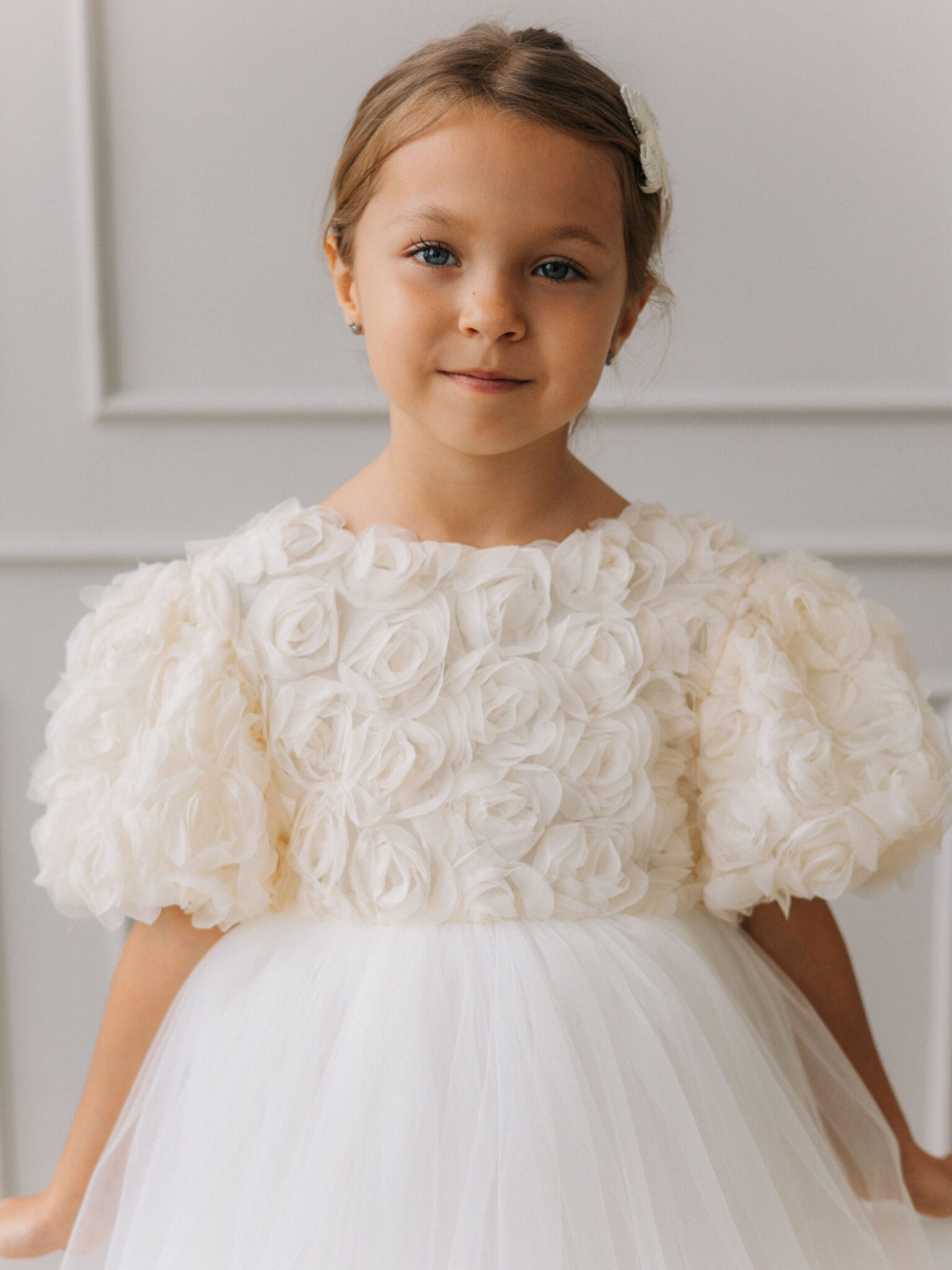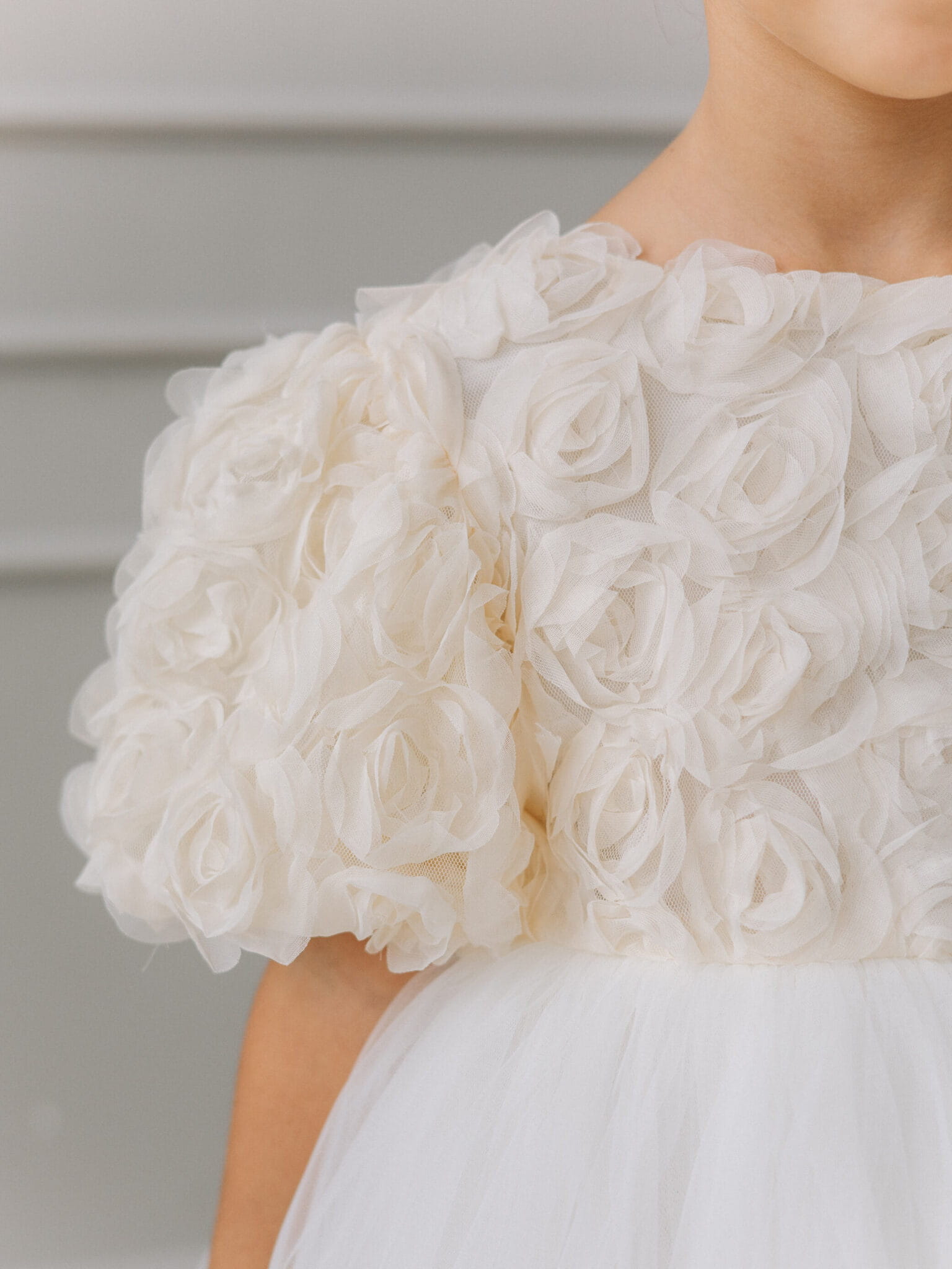 Sukienka została wykonana z tiulu w białym kolorze. Góra eleganckiej sukienki dla dziewczynki składa się z licznych aplikacji w postaci róż, które nadają całości wyjątkowego charakteru. Dół wykonany z mocno umarszczonego tiulu nadającego objętości. Zapinana z tyłu na kryty zamek oraz wiązana w pasie tiulowa kokarda.