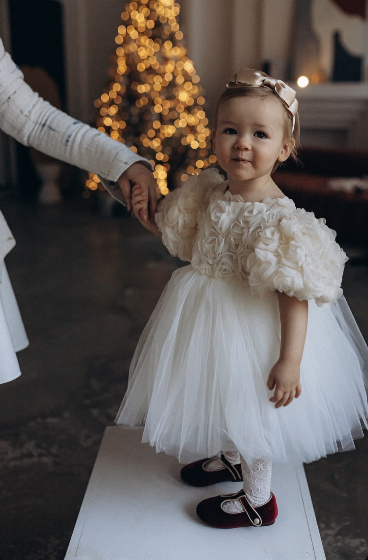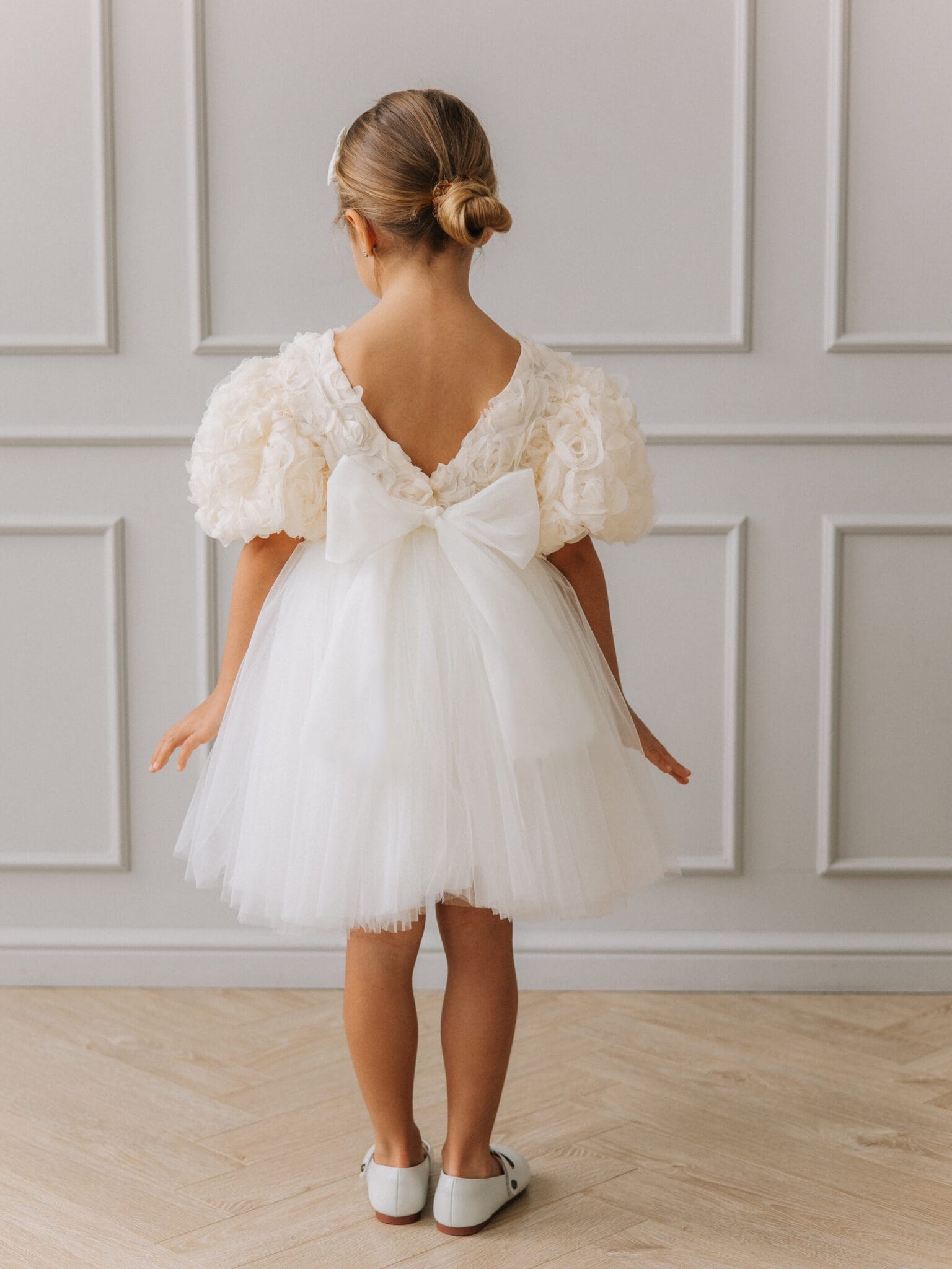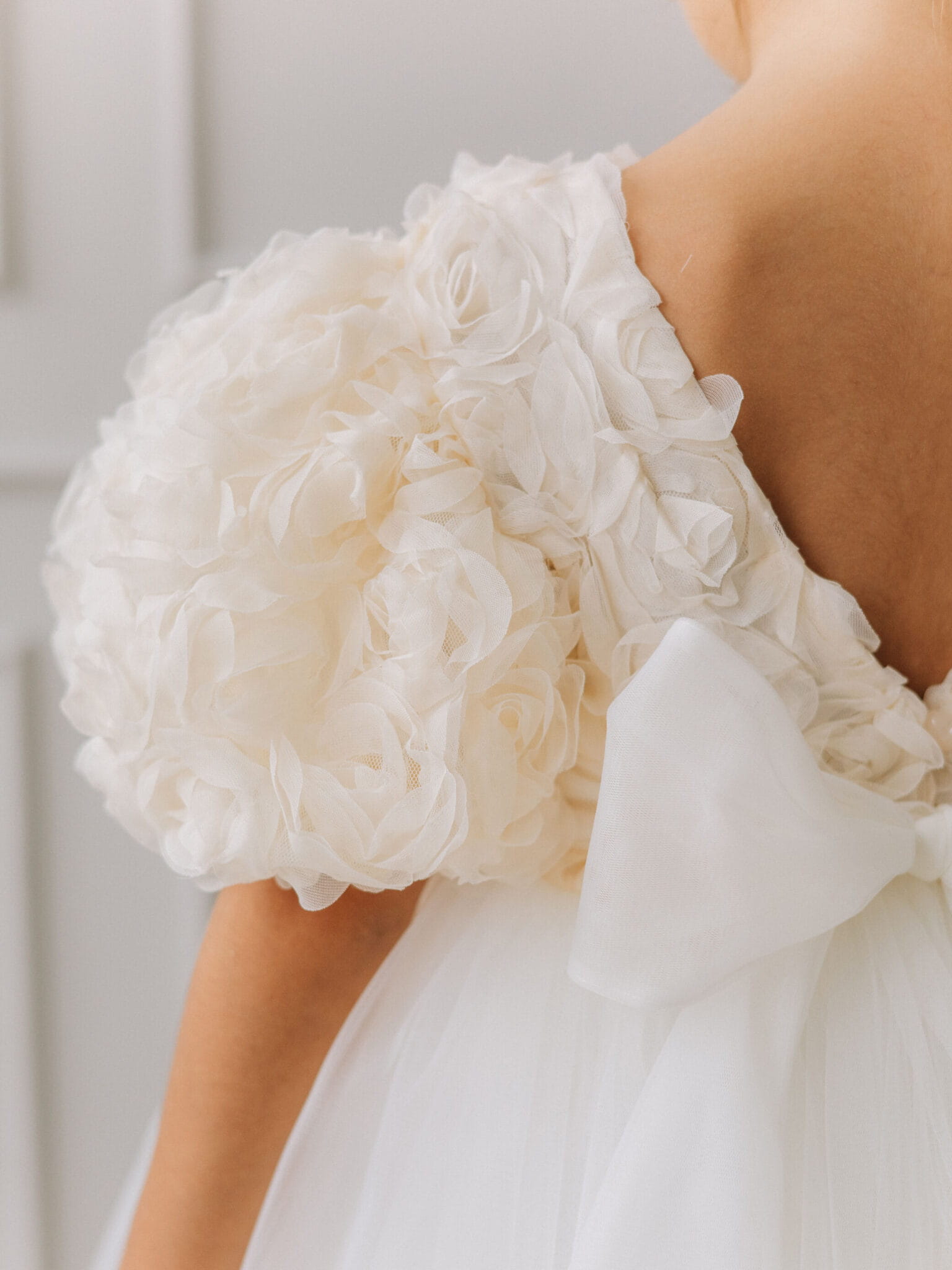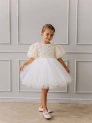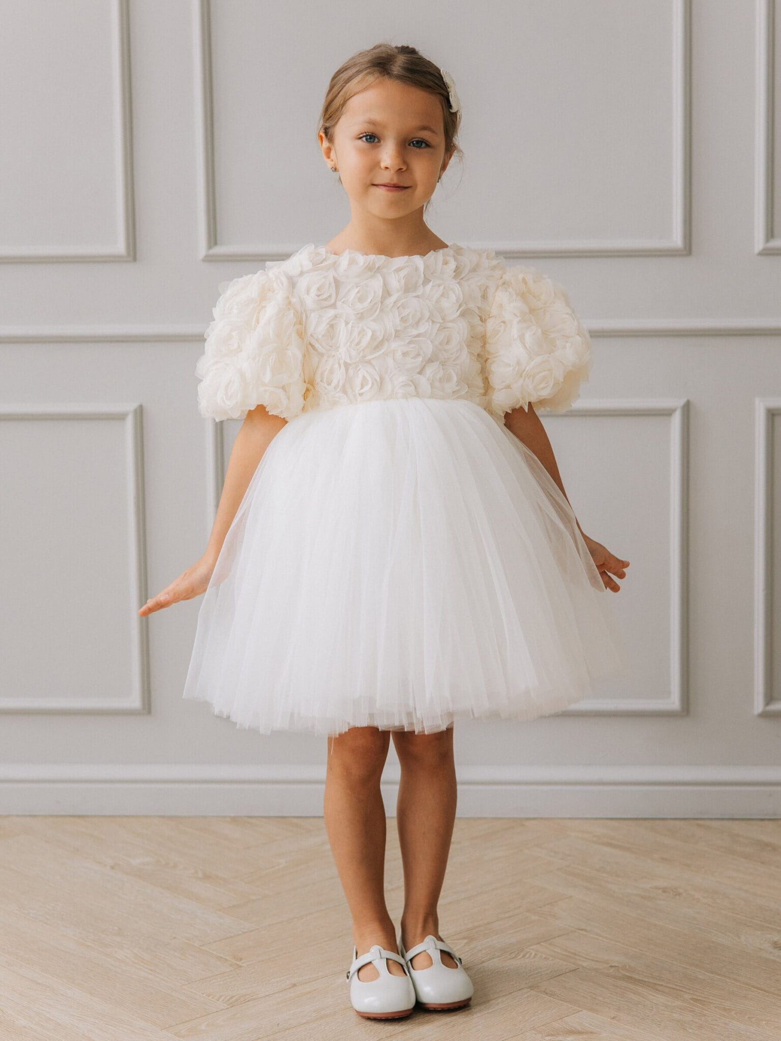 Sukienka została wykonana z tiulu w białym kolorze. Góra eleganckiej sukienki dla dziewczynki składa się z licznych aplikacji w postaci róż, które nadają całości wyjątkowego charakteru. Dół wykonany z mocno umarszczonego tiulu nadającego objętości. Zapinana z tyłu na kryty zamek oraz wiązana w pasie tiulowa kokarda.