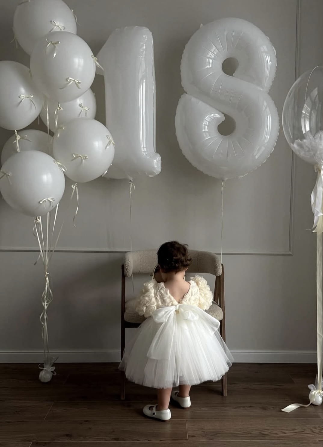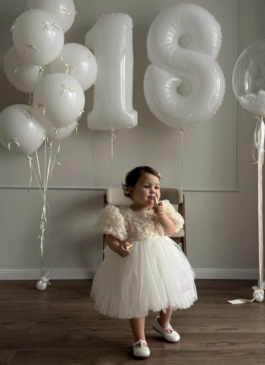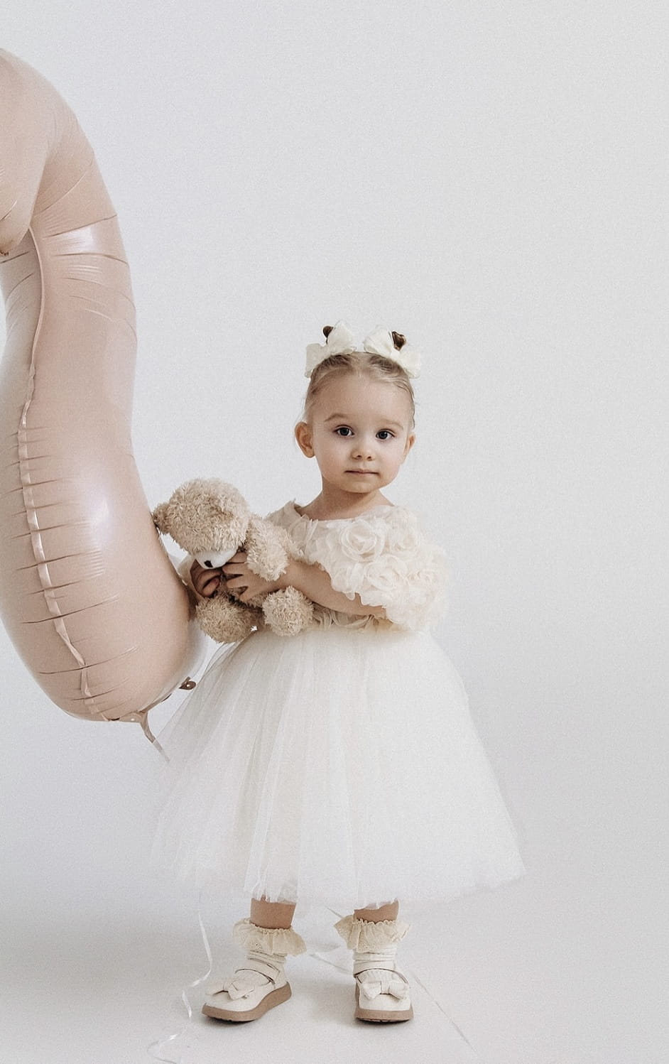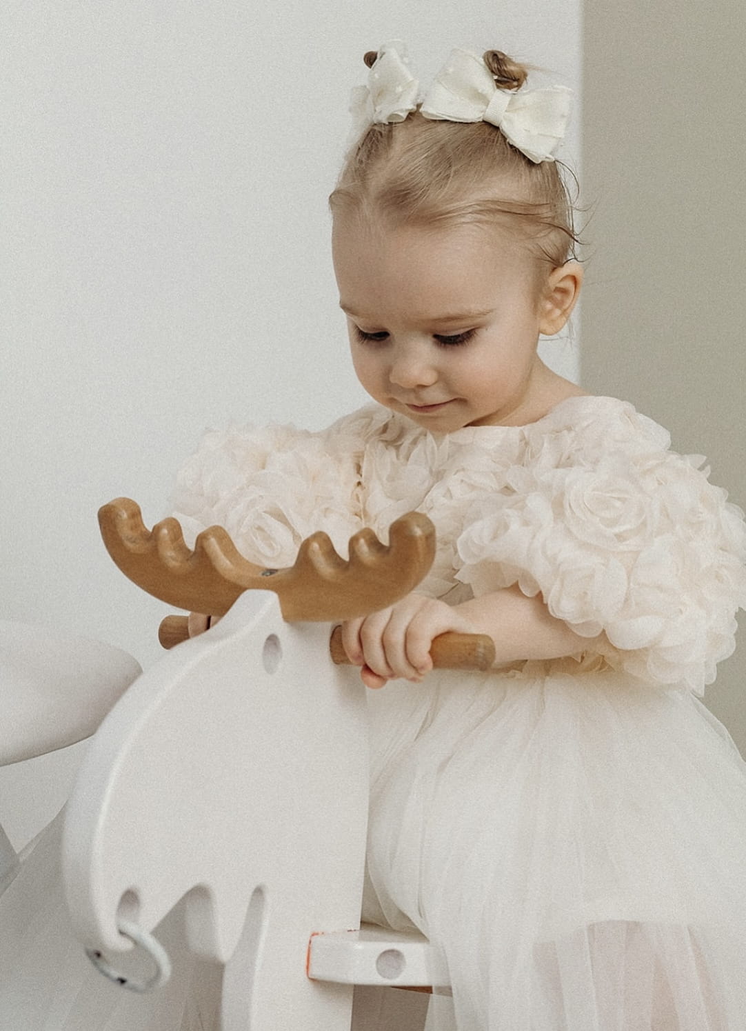 Sukienka została wykonana z tiulu w białym kolorze. Góra eleganckiej sukienki dla dziewczynki składa się z licznych aplikacji w postaci róż, które nadają całości wyjątkowego charakteru. Dół wykonany z mocno umarszczonego tiulu nadającego objętości. Zapinana z tyłu na kryty zamek oraz wiązana w pasie tiulowa kokarda.