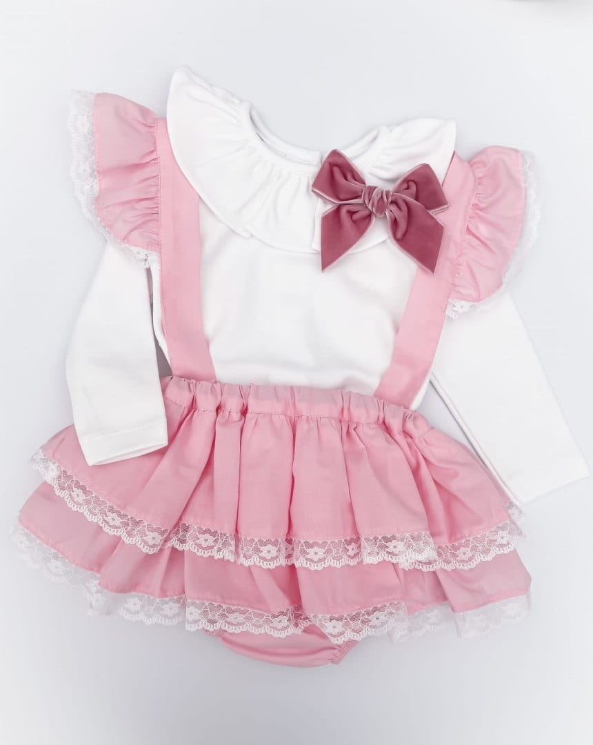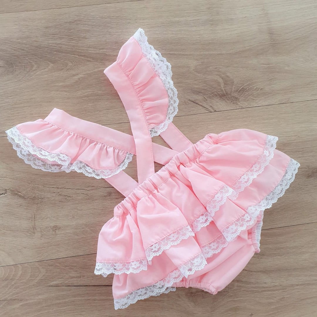 Bawełniany rampers z szelkami wykończony koronką, jakość premium.