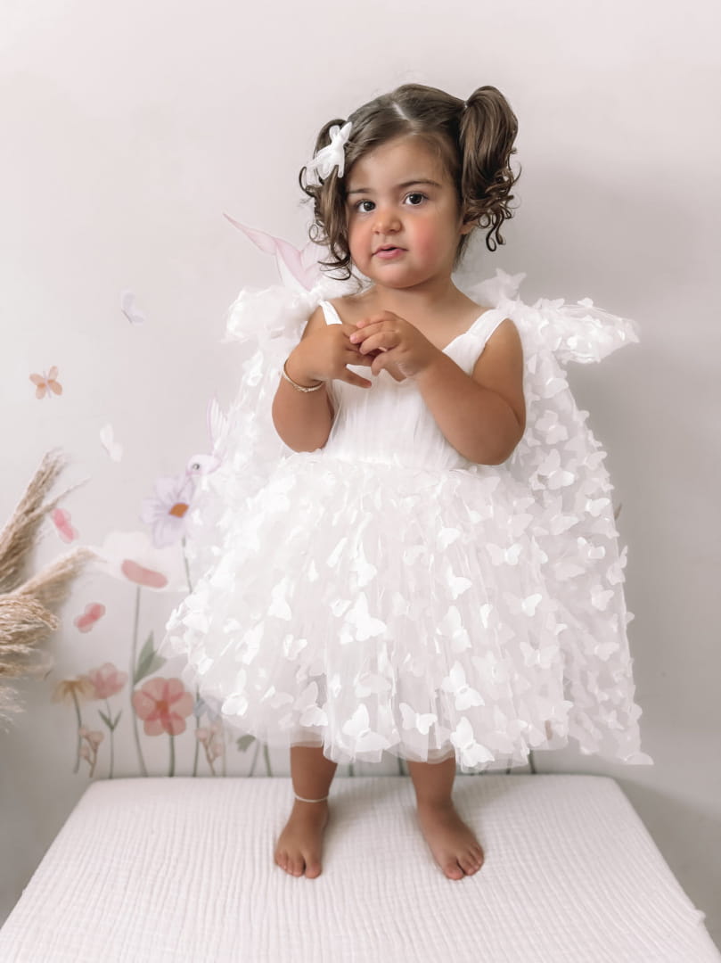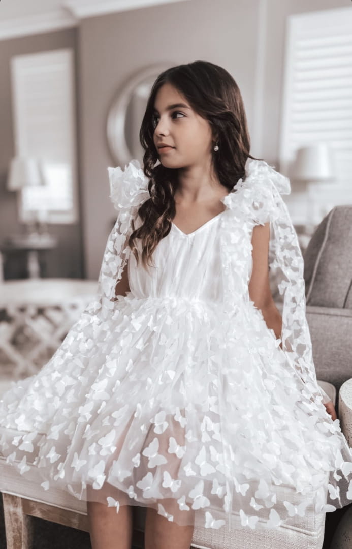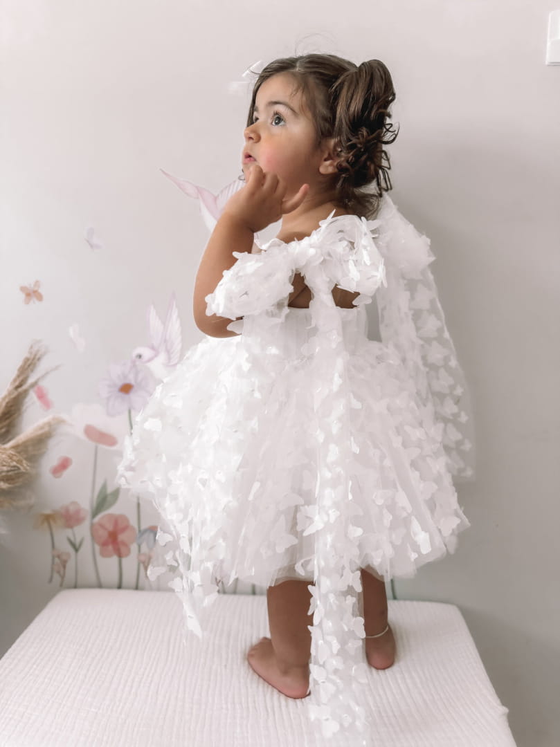 Przepiękna sukienka tiulowa z ozdobnymi motylkami i wiązaniem na ramionach.